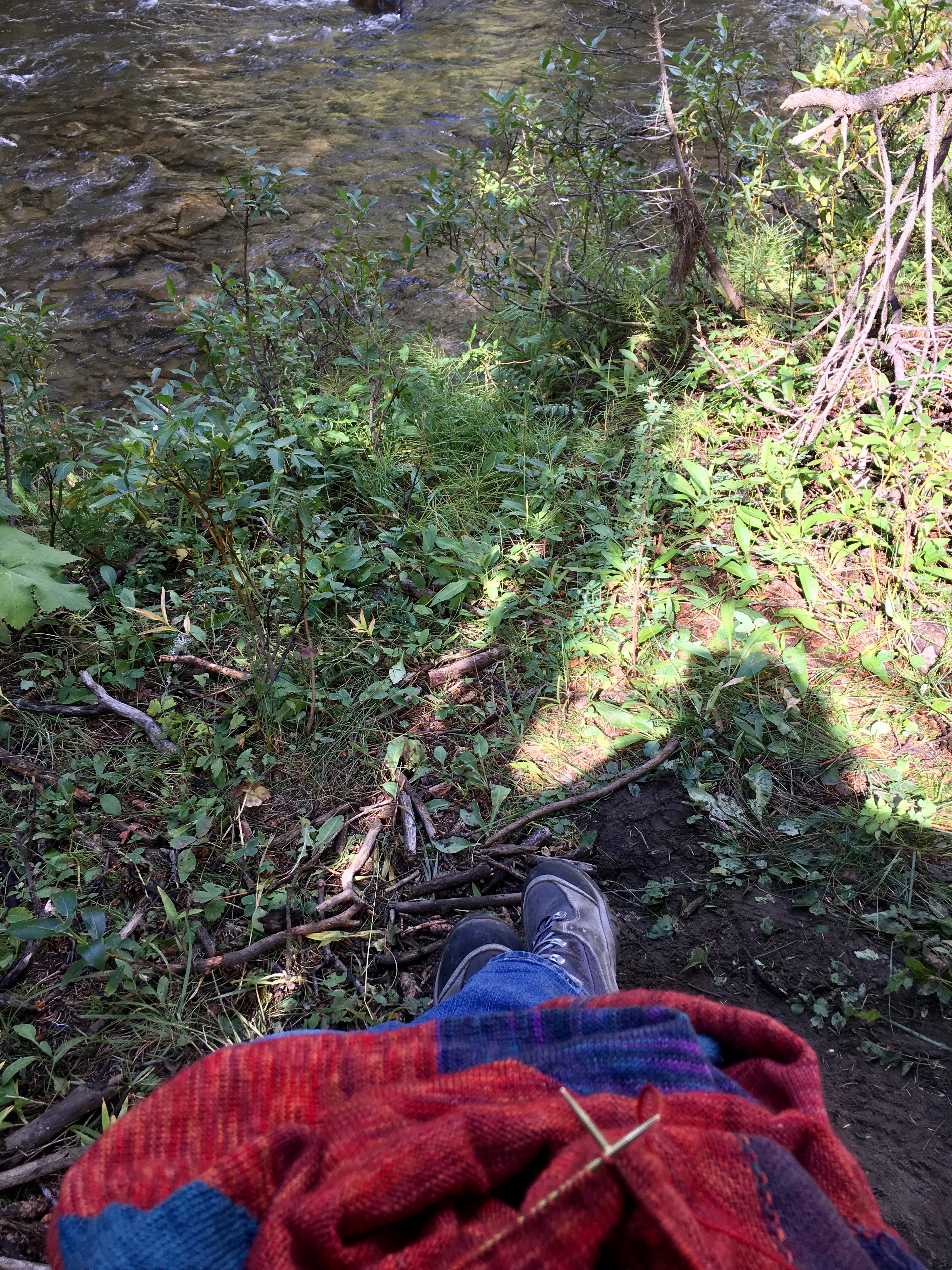 View up and down the river we were camped next to the river and Jody is fishing I am knitting.
