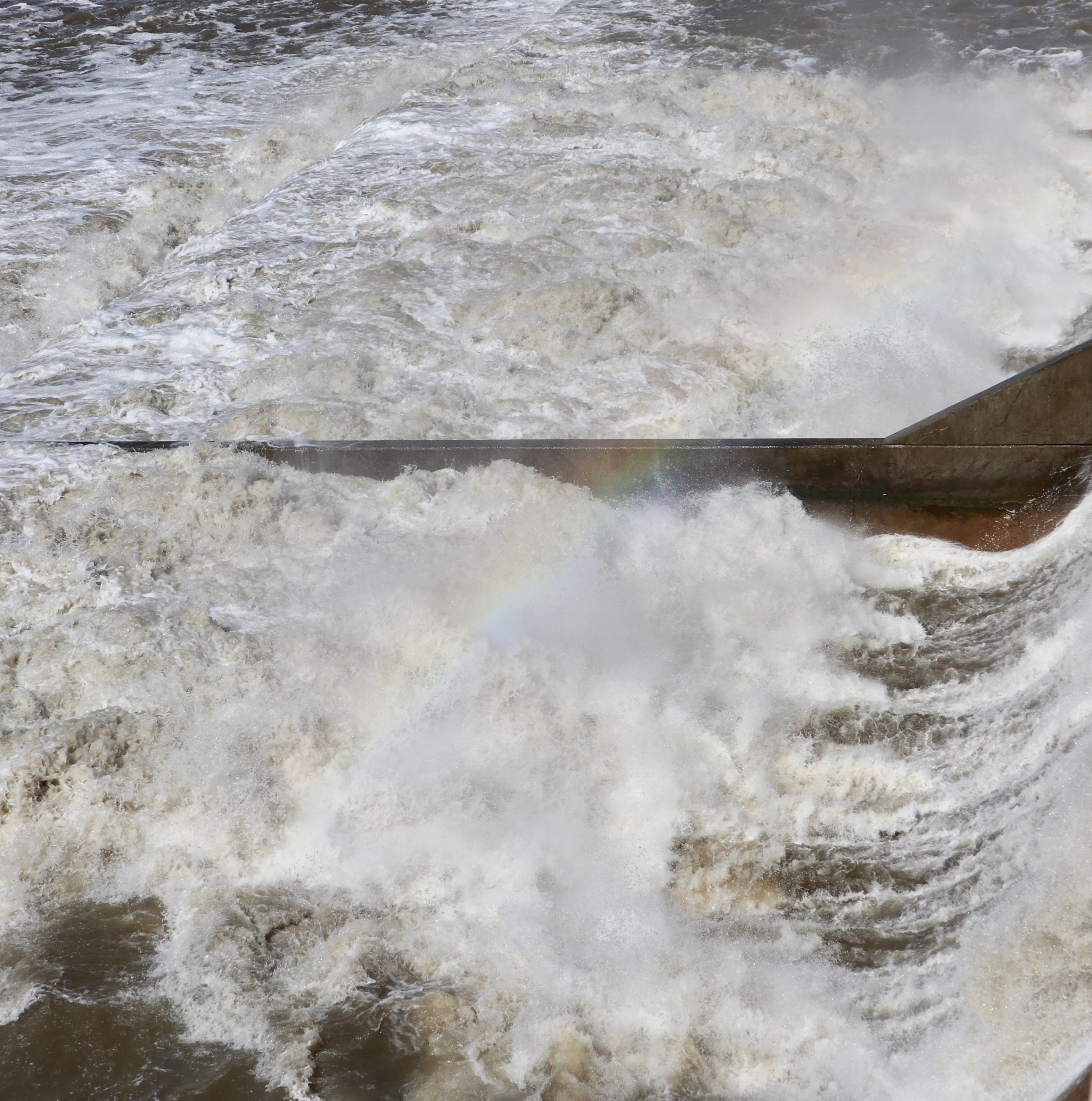 Always nice to catch a rainbow even a tiny one. Turbulent Waters. View from the Dam.